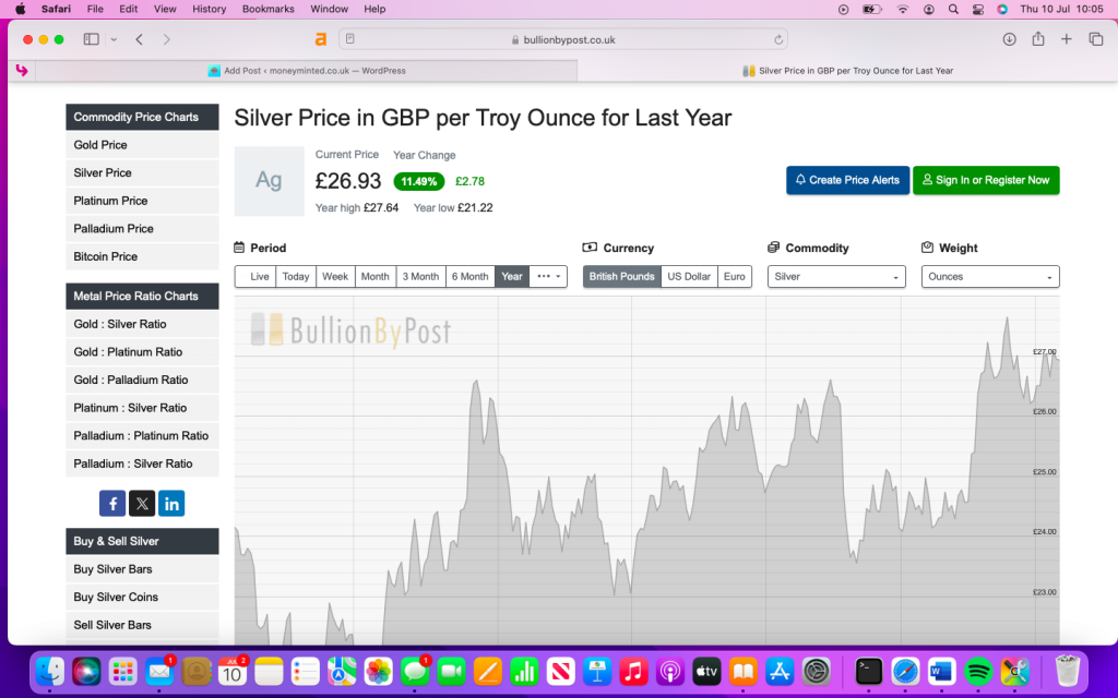 A simple option may be to purchase silver at a lower cost, again if we look at the following chart the price has gone up to £ 26.93 per Oz an increase of 12% this year.